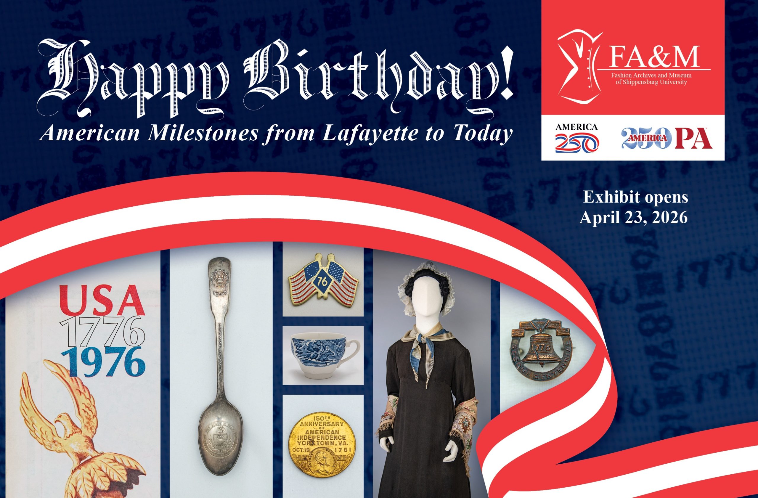 The Fashion Archives and Museum is pleased to announce the opening of Happy Birthday! American Milestones from Lafayette to Today. In conjunction with the 250th anniversary, this exhibition explores how Americans celebrated their independence in 1826, 1876, 1926, 1976, and includes fashions from each time. Visitors will enjoy the luxurious silhouettes of the eighteenth century, colonial revival fashions of the nineteenth and twentieth centuries, right up to the flappers of the 1920s and groovy styles of the 1970s. Historic souvenirs and textiles from these anniversaries illustrate Americans’ growing appreciation of their history and how they commemorated the nation’s founding through an increasing number and type of souvenirs.