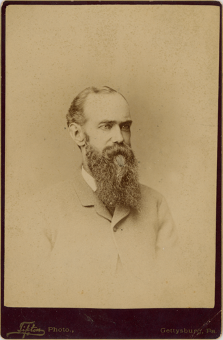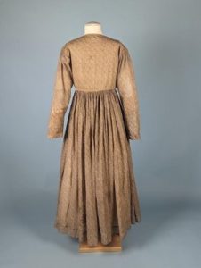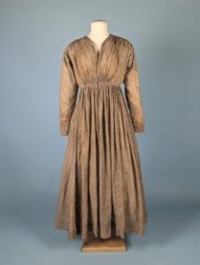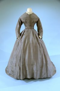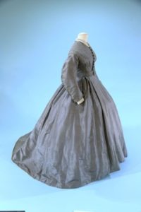 Less than two months later, as Maria and Charles settled into married life in a Gettysburg townhouse, they found themselves on the edge of perhaps the most significant battle of the Civil War. On the morning of July 1, 1863, Charles (by now an established photographer) descended into his darkroom to emerge a short time later to find a decidedly abnormal day. His waiting customer paid, and quickly vanished into the emptying streets as news of the Confederate invasion spread. Hurrying home, Charles met Maria coming the other way, close to the town square, looking for him. She had already packed their “wedding suits”—including her taffeta gown—into a trunk along with a few other belongings, and the Tysons fled, joining the stream of Gettysburg residents rapidly moving out of town. They hid the trunk in the basement of Mr. and Mrs. Daniel Brenner, who kept it safe behind Confederate lines by building a makeshift bed over top of it while the Rebels occupied their home above. The dress, along with the Tysons, survived the war, to eventually make its way to the FA&M. The gown’s matching bonnet and shawl–not pictured–survive in a private collection.