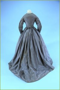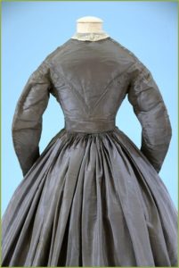 Charles and Maria wed three years later at the Griest family home on May 3rd, 1863. Maria’s wedding dress, a gray silk taffeta gown now in the collection of the Fashion Archives & Museum, probably originally pagoda or demi pagoda sleeves in addition to a skirt shaped for bell hoop. Maria likely considered a single-use wedding dress wasteful, and so by approximately 1866, she modified it to update to the coat-sleeves seen today, with a smooth skirt front and side pleats supported with an elliptical (rather than round) hoop, and a fuller “ski slope” style in the back. Other modifications include the new belt, bias trim, and worked buttonholes replacing possible original hooks and eyes. The gown’s excellent condition over 160 years indicates that while Maria updated the dress’s style and clearly wore it more than once, she reserved the gown for special occasions.