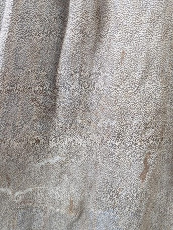 The Fashion Archives also holds another dress from Maria’s wedding trousseau, a lightweight summer dress that she eventually “demoted” to a daily work dress. Unlike the wedding gown, Maria’s work dress is a more ordinary, simpler garment designated for utility in its current form, and lacking the decorative elements and fine fabric of the more elegant wedding gown. Like the wedding gown, the wool challis work dress underwent modifications, although in this case the changes reflect restyling and repair rather than fashionable updates. The faded sleeves indicate that Maria likely wore this dress while washing clothes or similar tasks requiring her to plunge her forearms repeatedly into soapy water.