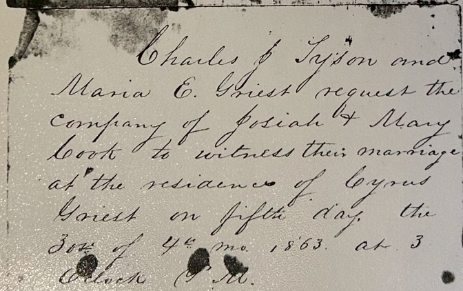Just before her 20th birthday, Maria met future husband Charles Tyson and his brother Isaac while the two men visited Adams County on a business trip in February 1860, almost by accident. In a letter written to his sister Ruthie in Philadelphia, Charles explained how a winter storm had interrupted the brothers’ travel plans and led them to share a horse-drawn sleigh with a stranger, who introduced them to the Griest family at the nearby Menallen Friends Meeting. Charles was clearly instantly smitten with Maria, and while his letter describes all of the Griests, he especially noticed Maria. Charles described her as “…a sweet girl somewhere about twenty […] very intelligent and very mild – my “beau ideal” of a “nice girl”.” Charles barely contained his enthusiasm, insisting to Ruthie that he was not yet in love, “but to speak candid, I think a few more visits up there would teach me how it feels to be in that predicament.” If Maria wrote about her own impression of Charles, it hasn’t survived, but in an addendum to the same letter, Isaac assured Ruthie that he had “…pitched in with [the Griests] generally and Lizzie [Griest] in particular, occasionally with Maria but found there was no show when Charlie was about.”